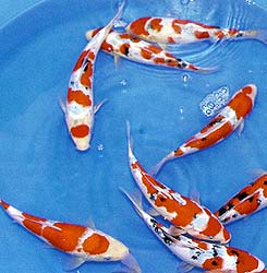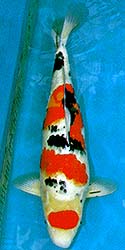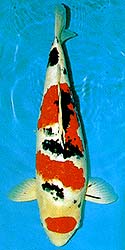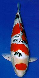 By that fall, at 18 months of age, it was apparent that Mr. Kawamura was the owner of a very special koi. With the sumi glistening like lacquer and the beni softly glowing, many would consider this Sanke to be fully "finished". Note the appearance of a classic black stripe on the left pectoral fin, and that the sashi (blurred kiwa) at the leading edge the second step in the pattern, has begun to fill in. By the end of her third year, Mr. Kawamura's Sanke had developed the imposing body confirmation that would eventually carry her to glory. The sumi, which had threatened to become overpowering, shows signs of breaking up, and the sashi at the leading edge of the second step, has filled in completely. The last photograph that we have of Mr. Kawamura's spectacular Sanke, was taken at the 22nd Tohoku Hokkaido Koi Show by our good friend Mr. S Baba. Now a mature 6 year old measuring 30 inches, she poses majestic and undisputed, Grand Champion. The Maruten which was once her charm point, is now her crown. Her sumi which once overran her red is no longer bold and boisterous, but has receded to a dignified depth. The addition of a single black stripe to her right pectoral fin, provides a final touch of elegance and perfection. The contribution that koi shows and photographs make, are vital to the growth and development of this wonderful hobby. Support your local (and National) koi shows, and remember to take lots of pictures of your koi!