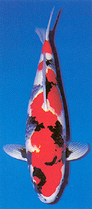 "Mail order Champion" Here in the United States, where establishments that carry quality koi are few and far between, the koi enthusiast often has very limited choices for koi procurement. The most logical solution to this dilemma is to order koi through the mail, by browsing through magazine advertisements or surfing the Internet. One would assume that would not be the case in Japan, but Sadao Kawamura claims that with his busy schedule, mail order has been the source of most of his koi purchases. Mr. Kawamura finds the most enjoyment in purchasing young koi and watching them develop in his care, a true connoisseur of tategoi. To facilitate his hobby, Mr. Kawamura has several mud ponds in addition to a large concrete finishing pond which is enclosed in a greenhouse. "I have a greater success rate when I purchase two year old koi," says Kawamura, "but more often than not, I am seduced by the potential of a yearling that I cannot resist." When studying photos of koi that are offered for sale, Mr. Kawamura confesses to using a magnifying glass to ferret out hints of hidden sumi (black) and potential yet-to-emerge patterns. Using this method, Mr.Kawakami purchased this Showa as a 14 inch two year old from Daie Yorijyo in Niigata. The koi had been advertised for sale in a Japanese magazine, and at first glance seemed to have little or no sumi other than the black half moon by the eye. Careful inspection, however, revealed a checkerboard pattern of kakure sumi (hidden black) that held the promise of an intriguing future. Upon receiving his purchase, Mr. Kawakami put the Showa into one of his mud ponds to be grown out. Little change was seen in the amount of black showing until the koi was moved into the concrete finishing pond where the sumi began to emerge rapidly.