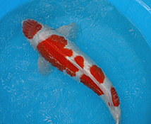 Toshiya Amemiya is a second generation koi breeder who had taken a hiatus from koi breeding to focus on other aspects of the family aqua culture business, but the Kamiya Kohaku project immediately became his only focus. Studying the inherent characteristics of the Kamiya Kohaku, Amemiya noticed that her red, white, her bone structure and the pronounced hump at her shoulders were all traits that were strikingly uncharacteristic of the Sensuke bloodline. Her size, at over 35 inches, was undoubtedly her most impressive feature considering the fact that she had been allowed to grow naturally, without the stimulus of winter growing in a greenhouse. Researching her past and following up on her sisters, Amemiya found that the un-Sensuke-like Kamiya Kohaku bore little resemblance to her siblings and that the traits that made her so attractive were truly unique to her. He soon came to the conclusion that the Kamiya Kohaku either received her dominant traits from her father, or that there may have been other influences in the Murata breeding that were not public knowledge. Amemiya began the serious task of selecting an appropriate male that would bring the other half of the gene pool to the project. After discussing his options with a number of other koi breeders, Amemiya became convinced that he needed to reincorporate a strong infusion of Sensuke blood into the bloodline. Not long after making this determination, Amemiya was visiting the Omosako Fish Farm in Hiroshima where he encountered an exciting discovery, a male kohaku, at this farm that normally was home to only Shiro Utsuri. When queried about the origins of the kohaku, Mr. Omosako explained that it was a Takigawa Sensuke, the origins of which came from the tremendous Donguri* line from Sakai of Hiroshima.