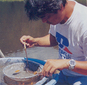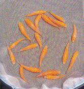 Donguri was the name of a Morita Sensuke that formed the basis for the incredible Sakai kohaku that have come to dominate the larger size divisions at koi shows in Japan over the past few years. Convinced that his encounter with the Takigawa Sensuke was an meeting with destiny, Amemiya purchased the koi to use as the lead male breeder. Because of her immense size, Amemiya realized that he would need a lot of helping hands if he intended to spawn the Kamiya Kohaku artificially. To that end, he enlisted the assistance of the Sakuma brothers, Futoshi Maruyama and Yuji Inoue, all world famous breeders in their own right. Again because of her large size, there was a real concern as to whether a single male koi would be adequate to fertilize the large amount of eggs that was anticipated. To cover this contingency, two "Chaser" males were added to the recipe, a Sakuma kohaku that was line bred from Dainichi's Kamenoko*, and a Maruyama Kohaku that could be traced to Dainichi's Panda*. Early in the summer of 2000, Amemiya headed the team of five breeders in a successful artificial spawning of the Grand Champion of the 30th All Japan Show, the Kamiya Kohaku. Forty four days later, Amemiya waited with baited breath as he hauled the nets in for the first culling of the Kamiya Kohaku. Much to his excitement, the initial results were even better than he dared expect. The patterning was far superior than usual and the fry already showed signs of the targeted Sensuke bone structure, but they still had a long way to go before he could breath easily.