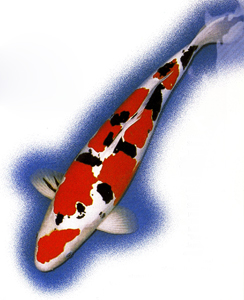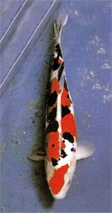 Doitsu Sanke Doitsu is the Japanese word for “German”, and “Doitsugoi” (German koi) is the word used to describe the various varieties of koi that were created by crossing the Japanese Nishikigoi with the German food carp. The first attempt at this method of cross breeding was done in 1910 by Mr. Yoshigoro Akiyama, who crossed an Asagi with the German carp to produce the Shusui. Cross breeding in subsequent years has produced Doitsu of nearly every imaginable variety, including the Doitsu Sanke. The Doitsu Sanke featured here belongs to Mr. Makoto Shinmi of Aichi prefecture in Japan. Although he does not know who the breeder was on this koi, Mr. Shinmi took an excellent photo of the Sanke when he purchased it as a 14 inch three year old. Although the Sanke exhibited the typically distinct colors that Doitsugoi are known for, it appears that the body was a bit thin and the sumi (black) rather over powering, almost to the point of obliterating the red pattern
