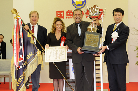 By the last week of January 2008, all that could possibly be done had been done and it was time to transport Alexandria from the Sakai Farm in Hiroshima to the Tokyo Ryutsu Center where the All Japan Show is held. Over 100 boxes of koi belonging to hobbyists from around the world were carefully transported by air, from Hiroshima International Airport to Haneda Airport which is just a few miles from the Ryutsu Center. Alexandria settled in nicely to her show tank on Thursday evening awaiting the judging which commenced on Friday morning. The show was judged by a total of 84 Shinkokai members who’s first task of the day was to select a Grand Champion. Each of the 84 judges has one vote and Grand Champion is determined by a simple majority. The first vote yielded 5 contenders for Grand Champion, a Sanke, two Showa and two Kohaku one of which was Alexandria. The second vote narrowed the field to a Dainichi Showa and Alexandria, and the third and final vote resulted with Alexandria awarded Grand Champion of the 39th All Japan Combined Nishikigoi Show In the years that have passed since I began writing the Tategoi series for KOI USA in 1995, I have been fortunate to have been witness to a number wonderful koi, but never in my wildest fantasies did I dream that I would be have the privilege of procuring a koi that could take Grand Champion at the Greatest Koi Show on Earth, the All Japan Show.