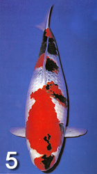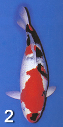 Long-Term Development How often do we get to witness the long-term development of a koi? Even in this day and age when owners are keeping more careful pictorial histories of their charges, it is a rare treat indeed to see a chronicle that spans over the course of a dozen years. This incredible Showa was bred in Niigata by Hashino Fish Farm and purchased as a 22” three-year old by Mr. Katsuhiro Ito of Chiba Prefecture. Although the photo is less than perfect, the inherent quality of this koi is apparent in its bold red and black, which are set against a strikingly white field. During its fourth year, Mr. Ito’s Showa was boarded as Hosokai Fish Farm in Niigata where it grew to about 25”. At this point it was entered in the 23rd Rinyukai Koi Show at the Tokyo Dome where it took 1st place 65 Bu Showa. Here we can clearly see that the sumi (black) has become markedly more pronounced without sacrificing any of its intensity, while the red and while have remained largely untouched.