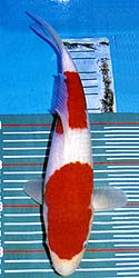 "The 'Grown On' Experience" In mid spring each year, the Y.K.C. koi club hold their annual "Tategoi" meeting at Yoshida Fish Farms in Hachioji, where yearlings from various breeders are offered to club members. Some of the members elect to take their purchases home with them, but most of the young tategoi are sent to Yoshida's growing ponds in Niigata where they are "grown on" until mid October. In the spring of 1994, I was delighted to be invited to participate in this event. The theme for that year was Kohaku and five show tanks were set up with Kohaku from Sakai (Hiroshima), Dainichi (Niigata), Ikenaga (Fukuoka), Matsue (Shimane) and Maruyama (Yamanashi). To be able to see and compare Tosai (yearlings) from so many famous breeders was an education in itself. Though all of the fish were basically 10 to 11 months old, sizes ranged from 5 inch Dainichi at the small end to an unbelivable 13 inch Ikenaga at the top end. With the understanding that sexing a young is never an exact science, all of the koi had been sexed by the breeders who sent them, and were purported to be females. Prices ranged from $100.00 to $3,800.00. The colors ranged from a blood red beni with razor sharp kiwa (edges) on the Dainichi koi, to a blurry indistinct orange on the koi from Matsue which is typical of the Sensuke bloodline at that age. At 10:00am Mr. Iitsuka of Matsue Nishikigoi Center gave a general explanation on how to select young Kohaku and some in depth pointers on each of the bloodlines that were present. At 10:30am, we were invited to stand in front of the show tank containing the koi that we intended to purchase. Naturally, the crowd was thickest around the tank containing the cherry red three step $100.00 Kohaku.