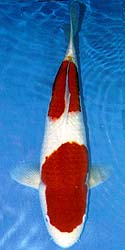 I had chosen the tank that contained the kohaku from Sakai, and had my eye on a koi that had an impeccable, albeit simple two step pattern. Although it looked a bit too red to be a young female, I thought that with a pattern like that it wouldn't really matter if it turned out to be a male. Once everyone was in position, we determined who got first pick by means of a children's game involving scissors, paper and rock. Having grown up in Japan, I considered myself an expert at this game and mustered all my childhood skills and managed to secure seventh position out of eight people. I was devastated. I held my breath as one by one the koi were selected until finally it was my turn. I couldn't believe it but the two step that I had originally been after was still in the tank! The first photo shows the Sakai kohaku at age 11 months measuring 12 inches. Delighted with my purchase, I elected to have it "grown on" in Niigata for the summer. I also purchased a 9.5 inch Shiro Utsuri bred by Mr. Iitsuka to keep my kohaku company during its sojourn in the mud ponds.