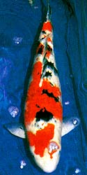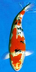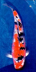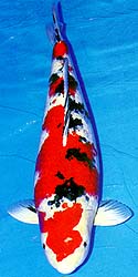 "Oops, Red Can Appear!" I was panning a young Kohaku for a hobbyist to look at the other day, when he asked me if I thought there was a possibility of more red coming up on the head, thus further enhancing the pattern. I laughed and said that with the exception of some Showa, red almost never "appears" where there was no red before. If and when red comes up where there was previously no red, it is almost always what is referred to as niban hi, or secondary red. This secondary red usually stays blurred and indistinct just below the surface of the skin or scales, and rather than enhancing the pattern, it usually destroys the koi's future as a tategoi or show koi. Thus assured of this particular kohaku's lack of potential, my would-be client thanked me and continued on his search for the perfect tategoi. While reading back issues of Gekkan Nishikigoi later on that same day, I stumbled upon the exception to the rule, the 1991 Grand Champion of the 27th Fukui Prefecture Combined Nishikigoi Show. This robust 9 year old Taisho Sanke owned by Hiroji Fujimoto of Fukui, was spawned at Dainichi Fish Farms in Ojiya in the early 1980's. It was no wonder that her four step pattern interspersed with lacquer like sumi (black) caught everyone's eye at the koi show. Her body confirmation was near perfect, and she carried her 31 inches with elegance. Note the small mado or "window" of white in the red of the head pattern.