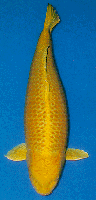 The beauty of a Kohaku lies in the purity of it's white body and the depth and intensity of the red patterns. The edges of the red markings should be crisp and clear against an unblemished white background. This crisp edge is referred to as the "kiwa". During the early 1900's, a new variety of koi was created by the addition of "sumi"(black) markings to the basic Kohaku patterns of red and white. This new variety was named Taisho Sanshoku, and is commonly referred to, as simply Sanke or Sanshoku. The positioning of the sumi accentuates the beauty of the overall pattern. The Showa, developed in the 1930's, features white and red markings against a jet-black base. The sumi is the basis for appreciation of this variety, forming a strong background against which the white and red markings interweave in interesting patterns. Showa that have comparatively more white than black are called Kindai (modern) Showa. Collectively, the Kohaku, Sanke and Showa are recognized as "Gosanke" which translates as "three families", while in the United States and Europe, they are often referred to as "The Big Three". In the Orient, these three varieties have long dominated the Koi Shows, and are by far the most popular with the Japanese koi keepers. By virtue of the results years of selective breeding, the quality of Gosanke has reached a level yet unparalleled by other varieties. Although there is an established core group of American hobbyists that share the passionate pursuit of The Big Three, this group is by far out-numbered by the thousands of newcomers to the hobby, who are attracted to some of the flashier breeds. The Kings of Koi for mainstream America are much more likely to belong to the Hikarimuji, Hikarimoyo, Ginrin or Kawarigoi categories. "Yikes!" you say, "Stop with the names already!" Bear with me and we'll try to work through them, one at a time. The literal translation of Hikarimuji is "light without pattern". The "light" part refers to the bright metallic sheen that characterizes the varieties that belong in this category. The "without pattern" portion indicates that the koi in this category should be a single color. Hikarimuji are very popular with the neophyte koi keeper, possibly due to the fact that they show so well against a green background. (Green water is the scourge of all koi keepers, but it seems to be particularly prolific in new ponds, or ponds that lack adequate filtration.) Some examples of Hikarimuji varieties are: